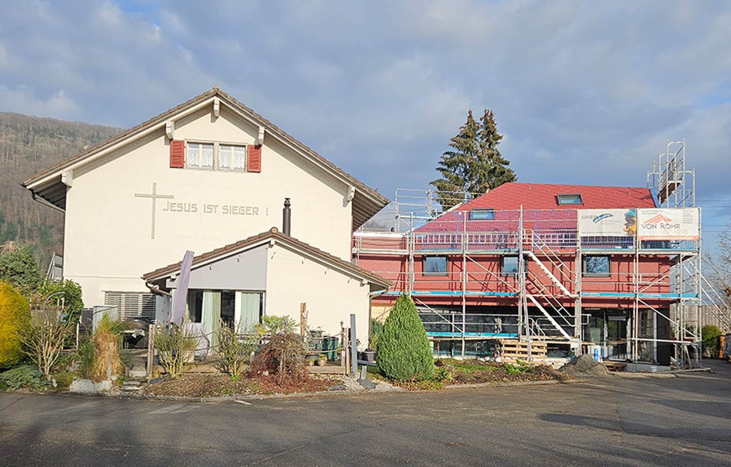 Gemeindehaus Rishaldenweg, Rothrist Der neue Saal ist per Ende 2024 fertiggestellt. Aktuell laufen die Ausbauarbeiten am bestehenden Gebäude.