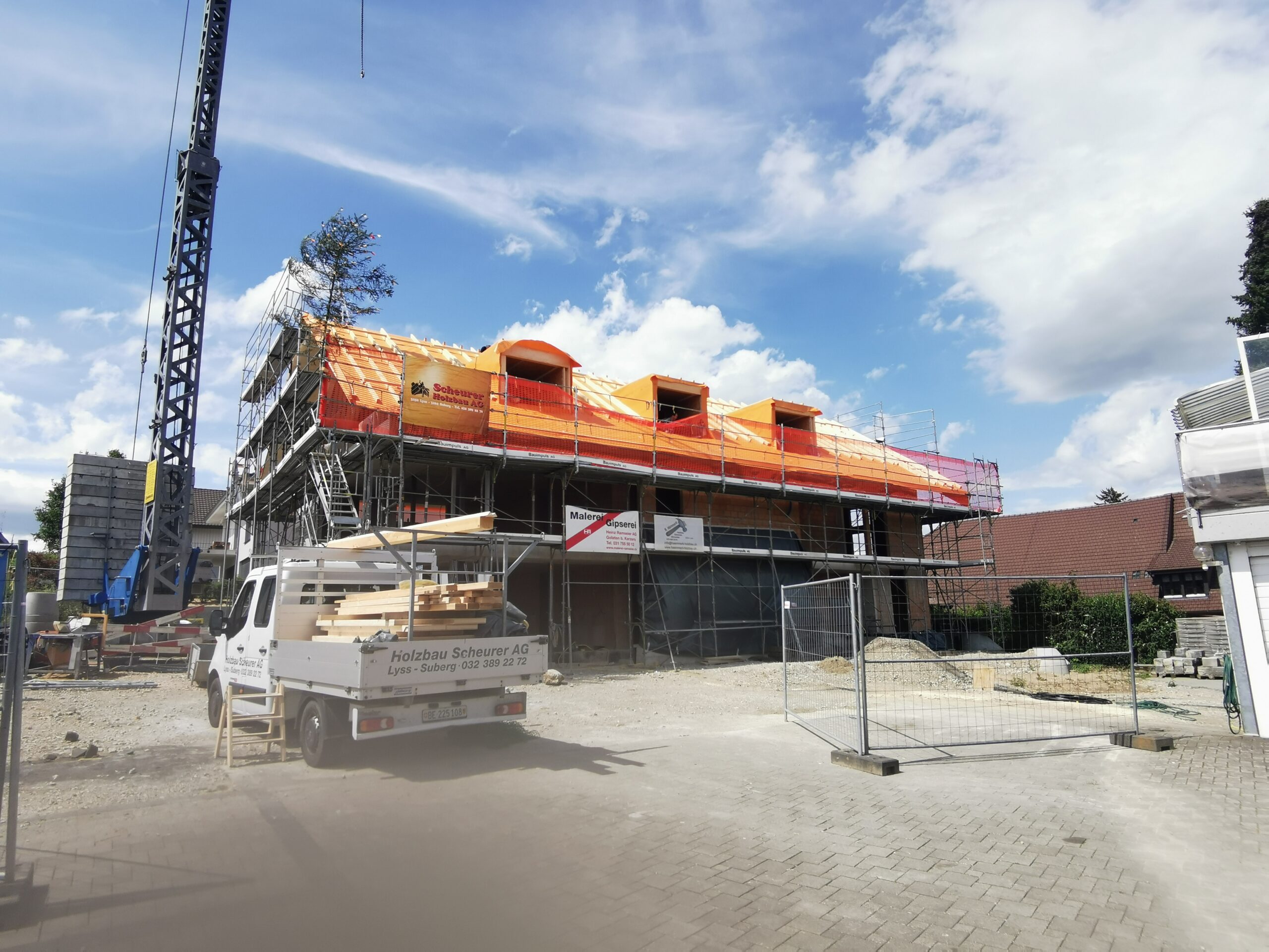 Das Mehrfamilienhaus konnte nach Fertigstellung des Rohbaus pünktlich vor den Sommerferien aufgerichtet werden.